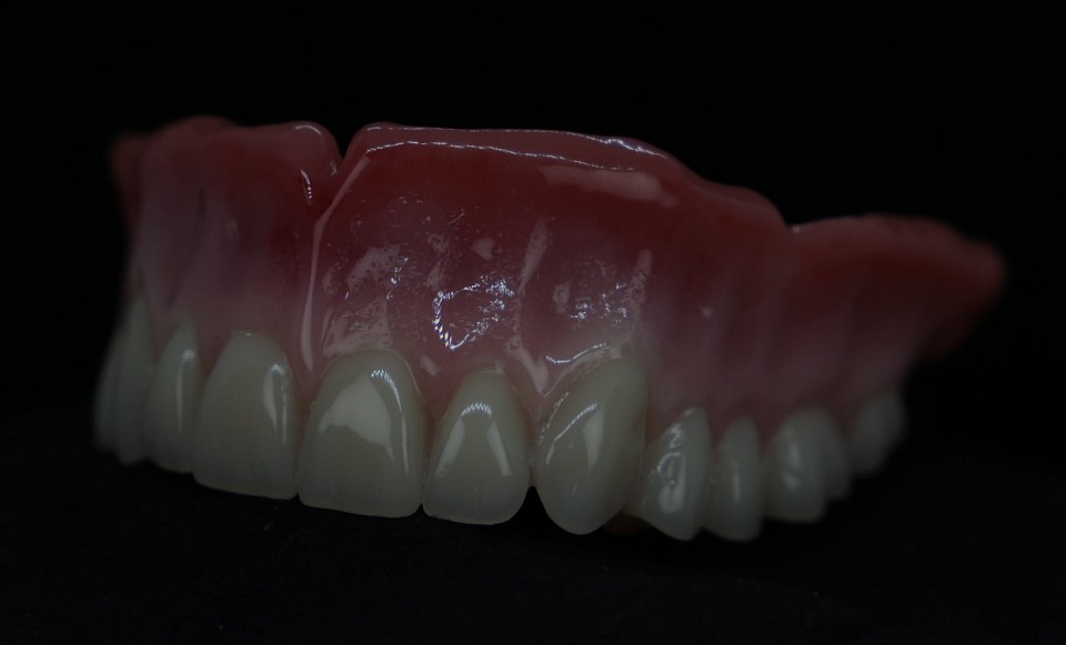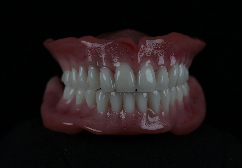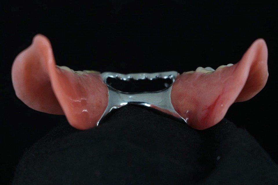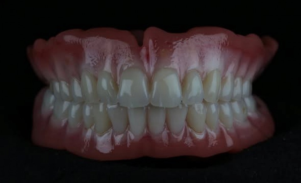 A fotókon egyik protézisünk, mely BioFIX talprésszel készült a nagyobb stabilitás elérése miatt, szájrózsás szájpadlással a komfortérzet növelése érdekében, fém erősítésekkel, illetve NaturalDent fogakkal az eredeti rágóképesség visszaállítására.