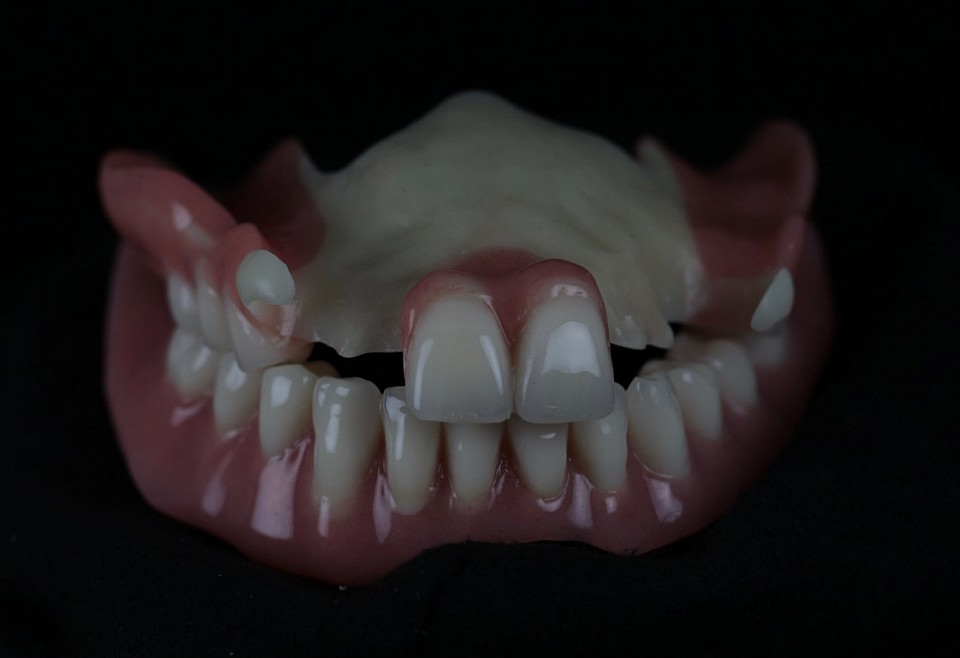 A fotón a viaszban rögzített fogak láthatóak, még az utolsó előtti munkafázis, a próba előtt.
